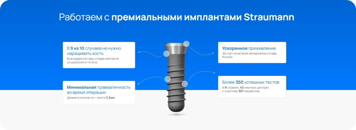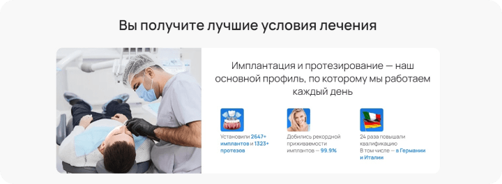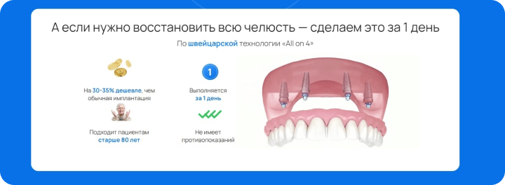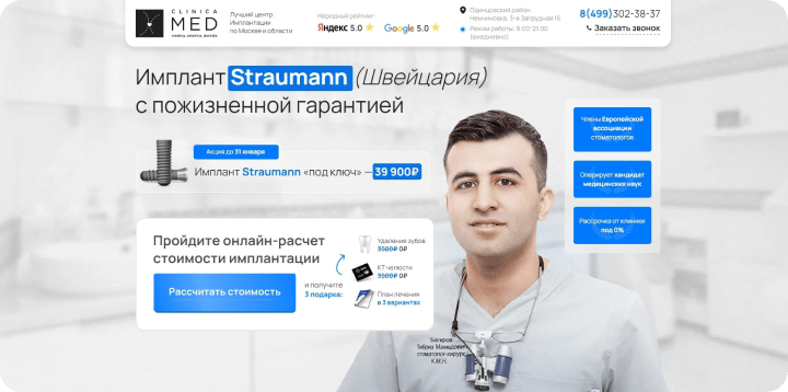 В каждом лендинге отобразили ключевые преимущества услуги — качество имплантов (в случае со Straumann), преимущества «All on 4» и доступность Osstem
